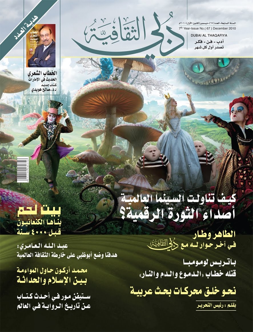 في كل عدد، تحرص مجلة دبي الثقافية، على طرح التساؤلات الهامة، ولفت المشهد الثقافي إلى القضايا الإشكالية، نقداً، وقراءة، واستشرافاً، وهي في عددها الجديد 67، تتساءل عن مدى الاستمرار في التبعية للهيمنة الغربية، ومتى سيكون للعرب محركات بحث خاصة بهم، تساعدهم على الحضور الفاعل، وتنقل إلى العالم الافتراضي آثارها في تشكيل الوعي، والحوار، وإعادة الشخصية العربية إلى مركزها المحوري، خاصة وأنها تتمتع بمخزون موروث ومعاصر يضاهي اللحظة، وهذا ما ناقشته افتتاحية "أجراس" للمبدع ورئيس التحرير سيف المري. وبالمقابل، تطير بنا "رفة جناح" إلى فضاء أرحب من الوحدة والآلام، لتشترك مع الآخرين في "رفع راية الإنسانية الحقيقية الكامنة في دواخلنا"، وهذا يجعلنا نقول مع مدير التحرير المبدع نواف يونس:"ضعفنا وقوتنا في الآخر". حفلت المجلة بالعديد من المواد والموضوعات والقضايا الثقافية، منها:"الأدب العربي وإشكالية الكتابة بالفرنسية"، "ستيفن مور"، "أبو العلاء المعري"، و"شعراء الإمارات وقصيدة النثر"، "مهرجان جواثي الثقافي"، "رائدة التجريب العربية، الفنانة سلوى روضة شقير"، ويطرح العدد أسئلة سينمائية تكنولوجية حول "الإبهار التقني"، تأثيره على المضمون الفني والأدبي، و"كيف تناولت السينما العالمية أصداء الثورة الرقمية"، ومن جهة ثانية، تحضر فلسطين من خلال أسراها في فيلم "المر والرمان". وتبرز آراء وشخصيات مثل:"محمد أركون"، و"ميخائيل نعيمة"، و"شوبان"، و"باتريس لومومبا"، و"أحمد الجسمي"، "عبد الله العامري"، "أسامة أنور عكاشة"، "محمود الشريف"، "سعد الجد"، وسواهم.. أما في أجنحة الخيال، فنقرأ: رقصة الدولفين/ أنثى بوجه ترابي/ معلقة الثلج/ هوامش/ أربع قصائد/ لا تحبي شاعراً/ رباعية المعاني/ صباحك/ يقنع بالوعد بين يديك/ الأحجار الكريمة المزيفة/ ثمن الظلمة/ مشهد مسرحي من "ماكبث" شكسبير. وفي الثقافة في شهر، تزدحم الفعاليات والأنشطة، لتعكس حراك المشهد الواقعي، بين تشكيل ومسرح وتراث وسيناريو وأدب، كما نقرأ تحقيقاً عن معرض الشارقة للكتاب. وتأخذنا "بانوراما" إلى "بيت لحم"، و"مملكة الرجال الزرق"، و"تدمر"، وفي رحلة أخرى، تطوف اللغة العربية حول أبعادها وإشكالاتها المعاصرة، كلغة وحروف ومستقبل، هذا..، إضافة إلى مقالات المجلة الثابتة والمتحركة. أخيراً، تفاجئنا بحدث ثقافي عن "نصوص جبران الأولى"، وحوار مع "غادة السمان"، و"آخر حوار للطاهر وطار". نذكر بأن جائزة دبي الثقافية، مازالت مفتوحة حتى (1/3/2011)، وأن هديتها الشهرية المجانية، كانت لهذا العدد كتاباً بعنوان:الخطاب الشعري الحديث في الإمارات. ***